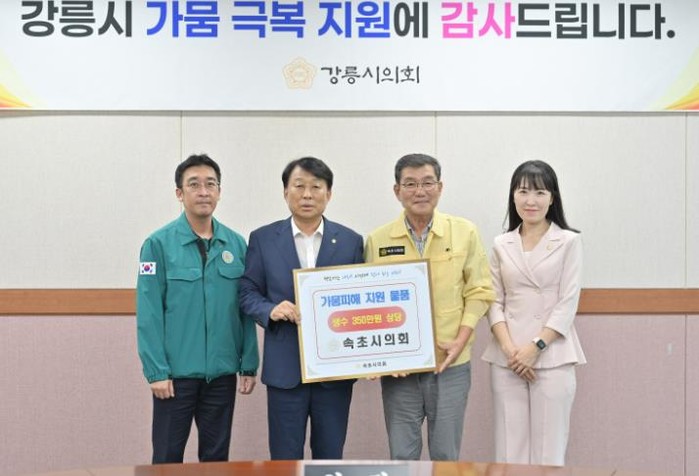 속초시의회는 12일 강릉시의회를 방문, 강릉시 가뭄 위기 극복을 위해 350만원 상당의 생수를 기탁했다.