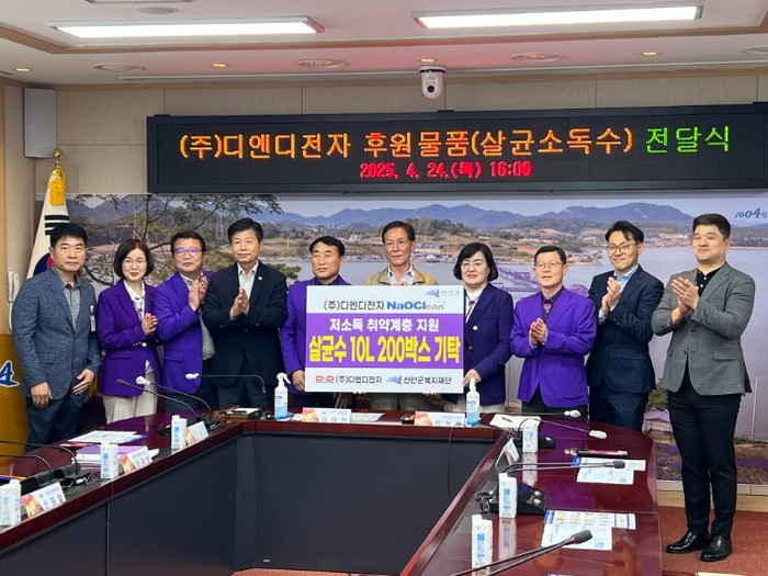 이날 전달식에서 ㈜디엔디전자(대표 서순기)는 500만 원 상당의 살균소독수 2,000L를 (재)신안군복지재단에 기탁했다.