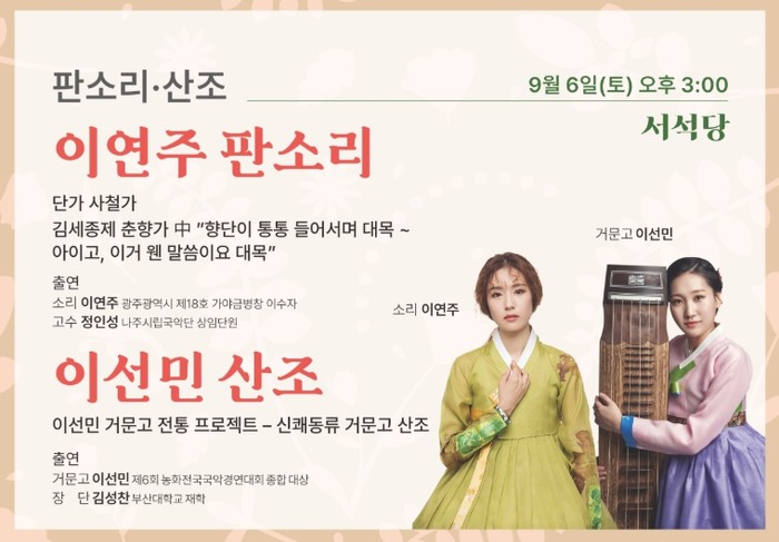광주문화재단 전통문화관은 오는 9월 6일(토) 오후 3시, 열일곱 번째 토요 상설공연을 선보인다.