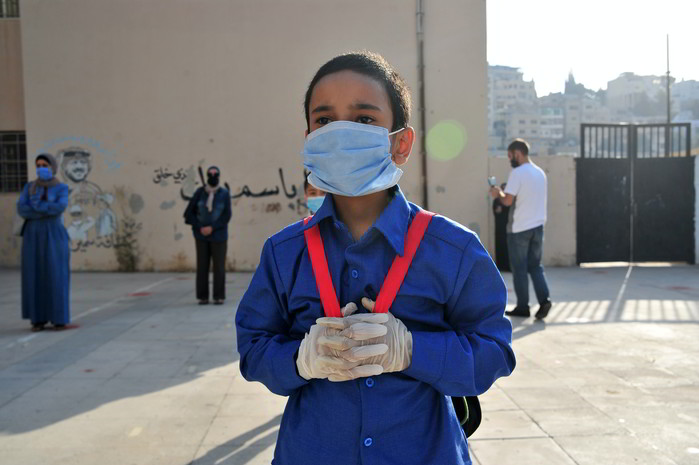 (프레스뉴스)채정병 특파원=코로나-19로 지난 3월부터 문을 닫았던 요르단 국공립 및 사립학교들이 1일(현지시간) 일제히 수업을 재개해 전국적으로 2백만명이 넘는 학생들이 학교로 돌아온 가운데 마스크와 장갑을 낀 학생이 아침조회에 참여하고 있다.