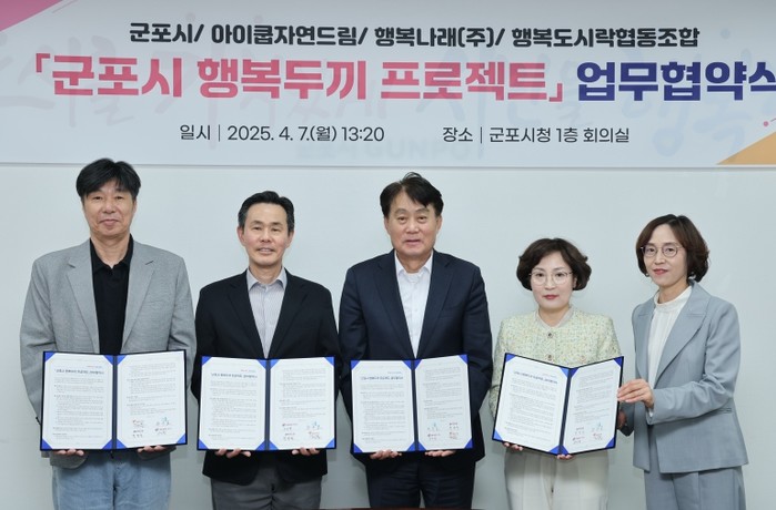 4월 7일 군포시청에서 군포시와 아이쿱자연드림, 행복나래(주), 행복도시락사회적협동조합이 함께하는 '행복두끼 프로젝트' 협약식이 진행됐다.