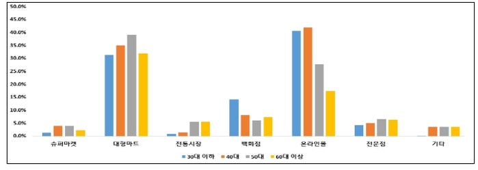 대형마트는 접근하기 쉽고 상품이 다양해서 이용한다고 답했고, 전통시장은 가격 만족도가 크고, 온라인몰은 배송이 편리해서 이용한다고 꼽았다.
