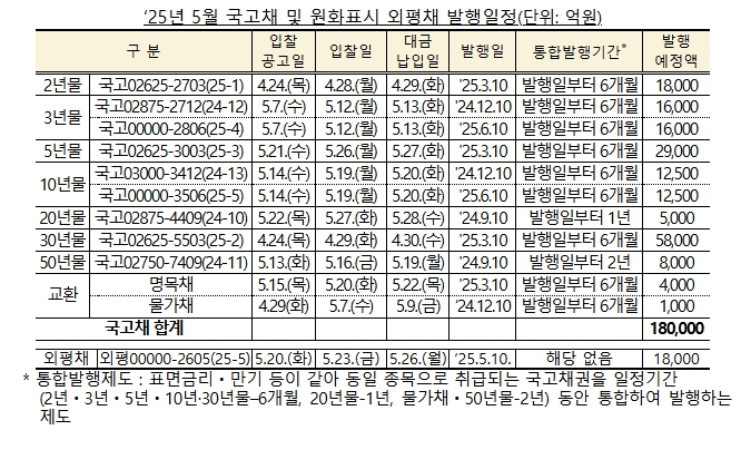 5월 국고채 경쟁입찰 발행 규모는 4월에 비해 5,000억원 증가한 금액이다. 연물별로는 2년물 18,000억원, 3년물 32,000억원, 5년물 29,000억원, 10년물 25,000억원, 20년물 5,000억원, 30년물 58,000억원, 50년물 8,000억원을 발행한다.