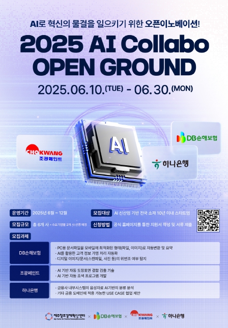 제주창조경제혁신센터는 DB손해보험, 조광페인트, 하나은행과 함께 ‘2025 AI 콜라보 오픈그라운드 프로그램’을 첫 출범한다.