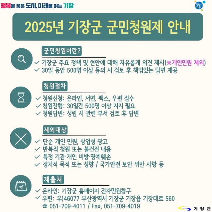한편, 청원신청은 ▲군홈페이지 전자민원 ▲서면 ▲팩스 ▲우편 등을 통해 가능하며, 기타 군민청원제와 관련된 사항은 기장군 기획감사실(☎051-709-4011/Fax 051-709-4019)로 문의하면 된다.