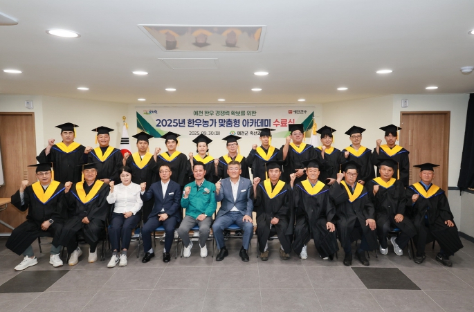 예천군은 30일 오후 4시, 단샘어울림센터 회의실에서 한우농가 30명이 참석한 가운데 2025년 ‘예천한우 맞춤형 아카데미 수료식’을 개최했다. 이번 수료식에는 김학동 군수도 함께해 수료자들을 격려했다.
