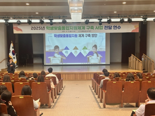 경상북도 김천교육지원청은 10월 13일 월요일, 김천학생문화예술센터 드림마루에서 관내 52개 초‧중‧고등학교 행정실장 및 업무담당자를 대상으로 2025년 학생맞춤통합지원체계 구축을 위한 전달 연수를 개최했다.