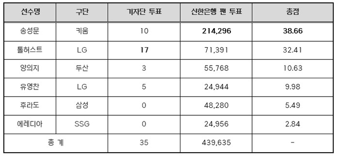 송성문은 기자단 투표 총 35표 중 10표(28.6%), 팬 투표 43만 9,635표 중 21만 4,296 표(48.7%)로 총점 38.66점을 받아, 기자단 투표 17표, 팬 투표 7만 1,391표로 총점 32.41점을 기록한 LG 톨허스트를 제쳤다.