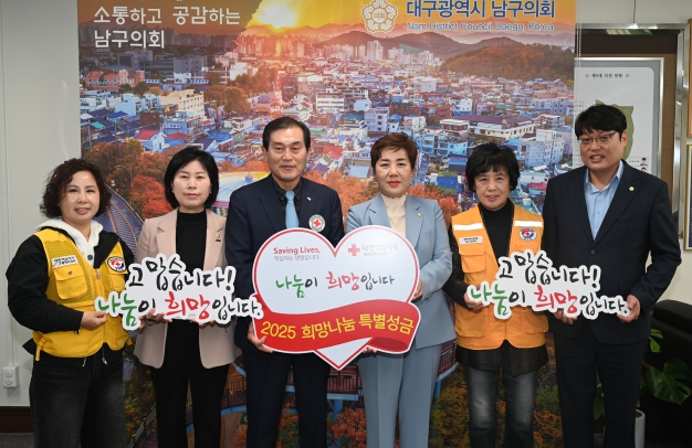 대구광역시 남구의회는 3월 21일 의장실에서 대한적십자사에 특별성금을 전달하며 지역사회의 나눔문화를 조성하는 데 앞장섰다.