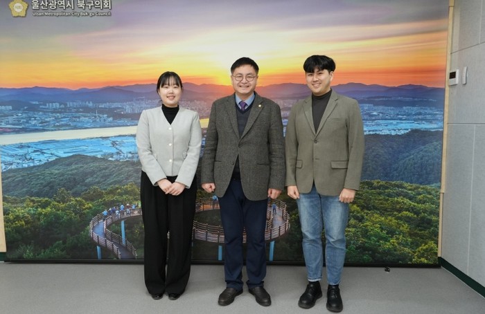 | ▲ 울산북구의회 김상태 의장이 10일 의장실에서 북구청년정책협의체 이여진 위원장과 남구청년협의체 정준범 위원장을 만나 간담회를 갖고 지역 청년 정책 현안을 논의했다. |