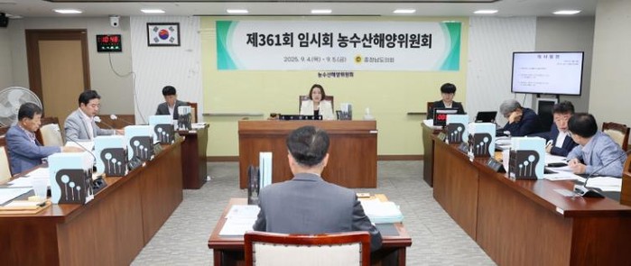 충남도의회 농수산해양위원회는 4일 제361회 임시회 제1차 회의에서 충남도 남부출장소‧농업기술원 소관 2025년 추가경정예산안과 남부출장소 2025년도 출연계획안을 심사했다.