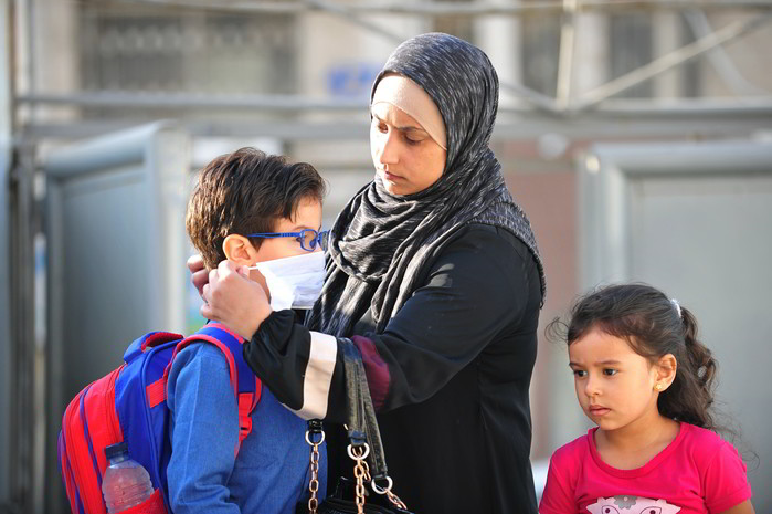(프레스뉴스)채정병 특파원=코로나-19로 지난 3월부터 문을 닫았던 요르단 국공립 및 사립학교들이 1일(현지시간) 일제히 수업을 재개해 전국적으로 2백만명이 넘는 학생들이 학교로 돌아온 가운데 한 여성이 자녀에게 마스크를 씌워주고 있다.