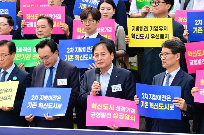 이어 참석한 결의대회에서는 전국혁신도시협의회, 노동조합협의회 등 200여 명과 함께, 수도권 공공기관 2차 이전은 혁신도시 이전이 원칙임을 천명하고, 혁신도시 정주 여건 개선과 추가적인 공공기관 이전 필요성을 강조하는 공동건의문을 발표했다.