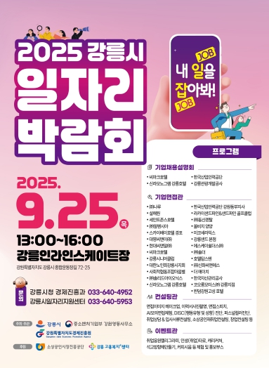 강릉시는 중소벤처기업부 강원영동사무소, 강원특별자치도경제진흥원과 함께하는 '2025 강릉시 일자리 박람회'를 오는 9월 25일 오후 1시부터 4시까지 강릉인라인스케이트장에서 개최한다.