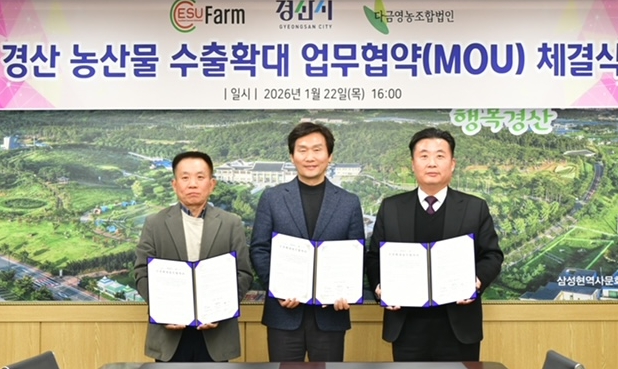 경산시는 22일 미국 뉴저지에 본사를 둔 농산물 유통기업 ESU, 다금영농조합법인과 샤인머스캣을 비롯한 경산 농산물 수출 확대를 위한 업무협약을 체결했다.