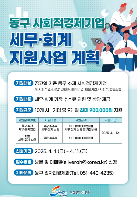 부산광역시 동구는 지역 내 사회적경제기업의 지속가능한 성장과 건전한 경영환경 조성을 위해 ‘동구 사회적경제기업 세무·회계 지원사업’을 추진한다고 3월 31일 밝혔다.