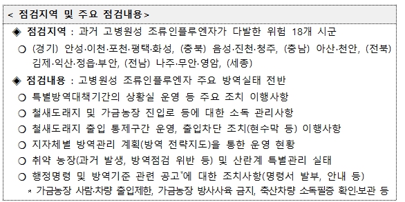 과거 고병원성 조류인플루엔자가 다발한 18개 시·군 대상으로 10월 15일부터 10월 24일까지 관계기관(농식품부·행안부·검역본부·시도) 합동점검 추진