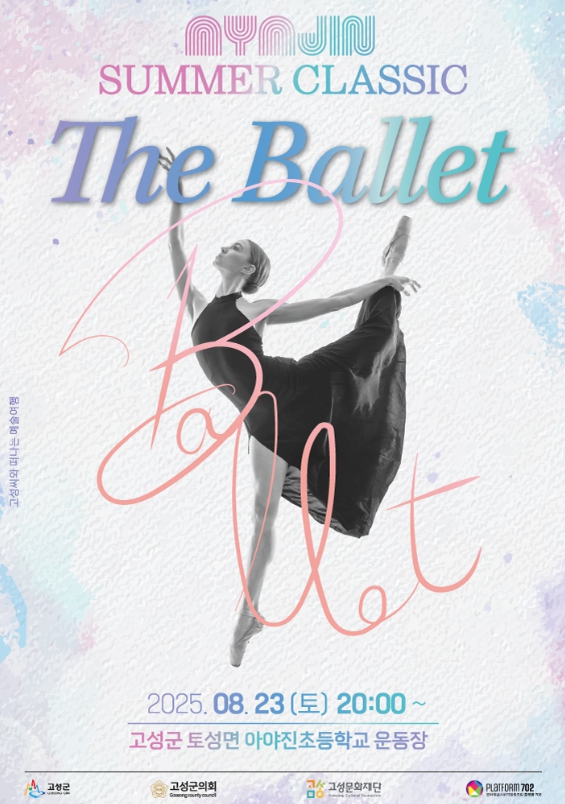 (재)고성문화재단(이사장 함명준)이 주최하고 문화예술사회적협동조합 플랫폼702가 주관하는 야외 발레 공연 ‘아야진 썸머 클래식 – The Ballet’이 오는 8월 23일 토요일 오후 8시, 고성군 토성면 아야진초등학교 운동장 특설무대에서 개최된다.