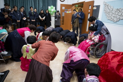 한복을 차려입은 시설 입소 장애인들과 일일이 만나며 새해 덕담을 나누던 이 지사는 단체로 ‘맞세배’를 하며 명절 분위기를 돋웠다.
