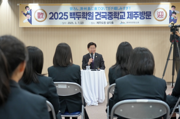 오영훈 지사는 7일 오후 도청에서 일본 오사카 재일한국인 학교인 백두학원 건국중학교 학생들을 초청해 환영 간담회를 가졌다.