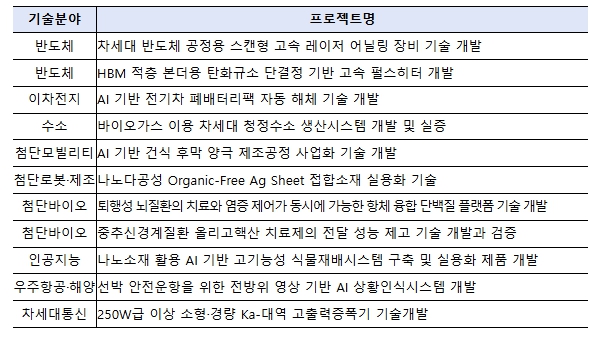 주요 제안 내용은 차세대 반도체 공정용 스캔형 고속 레이저 어닐링 장비 기술 개발, 퇴행성 뇌질환 치료와 염증 제어가 동시에 가능한 항체 융합 단백질 플랫폼 기술 개발, AI 기반 전기차 폐배터리팩 자동 해체 기술 개발 등이다.