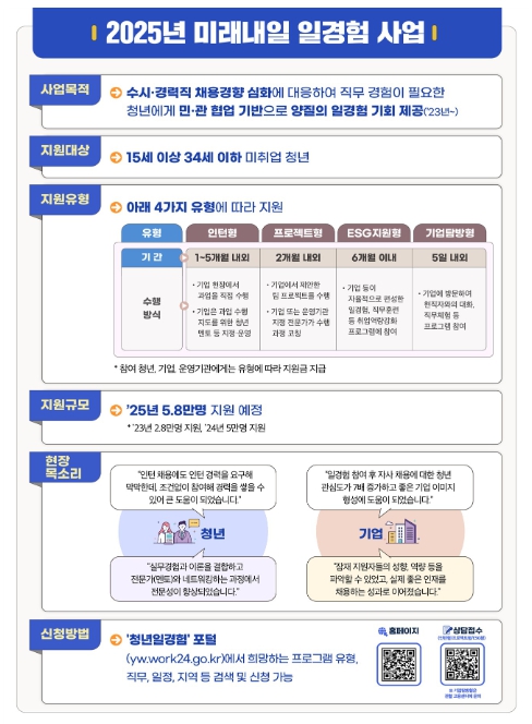 임영미 고용정책실장은 “기업이 필요한 시점에 즉시 투입 가능한 인재를 확보하려고 하는 수시·경력직 중심 채용 경향이 심화되는 상황에서 청년들이 원하는 일자리를 찾을 수 있도록 하기 위해, 청년들이 다양한 분야의 일경험과 현장 중심의 교육·훈련을 통해 직무 역량을 높일 수 있도록 지원을 강화해 나가겠다”라고 밝혔다.
