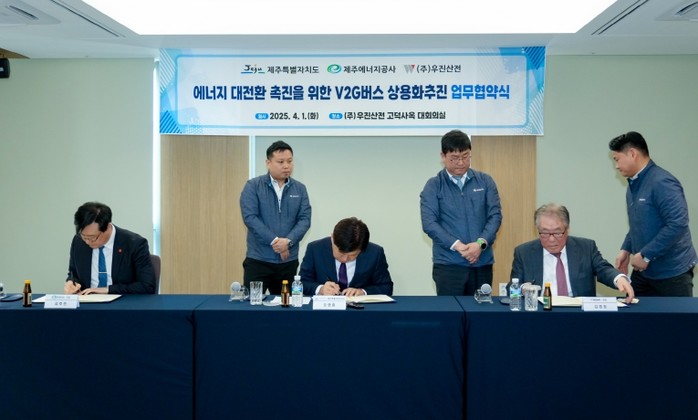 제주도는 1일 서울 강동구 소재 ㈜우진산전 고덕사옥에서 제주에너지공사, ㈜우진산전과 ‘전기버스 전력 양방향 거래 기술(V2G 버스) 상용화를 위한 업무협약’을 체결했다.