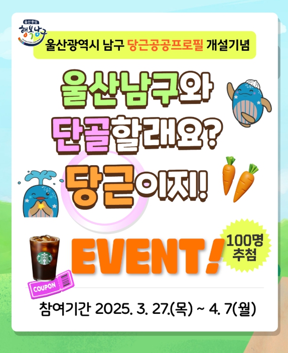 참여 방법은 당근 앱 검색창에서‘울산광역시 남구’를 검색 후 공공프로필 내 ‘단골맺기’버튼을 클릭하고, 캡처한 사진을 네이버 폼에 등록하면 되며, 울산 남구와 단골을 맺은 100명을 추첨해 모바일 커피쿠폰을 경품으로 제공할 예정이다.