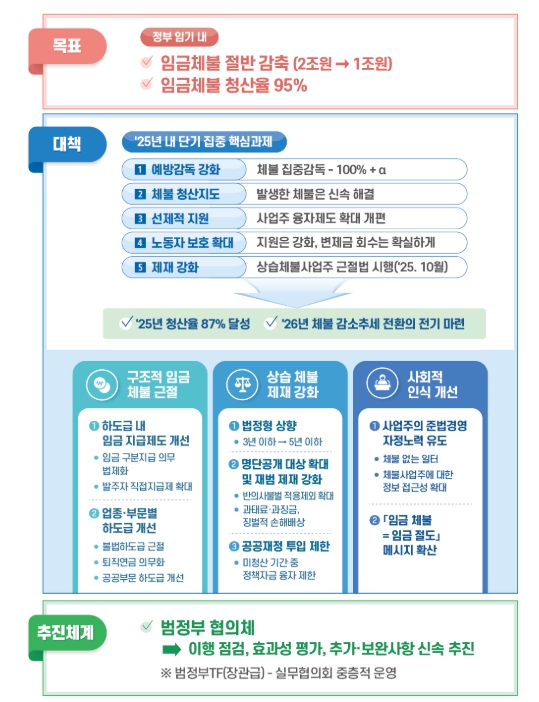 정부는 이번에 마련된 범정부 대책을 통하여 정부 임기 내에 국민이 체감할 수 있는 임금체불의 실질적 감축을 달성하는 계기를 마련하겠다고 밝혔다.