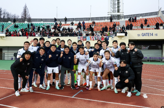 | ▲ 지난 3월 8일 안양원정에서 승리한 김천상무 선수단이 사진을 찍고 있다 |