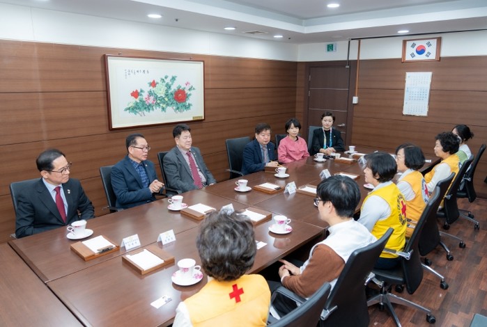 | ▲ 강남구의회 의원들과 대한적십자사 강남지사 관계자들이 이야기를 나누고 있다 |