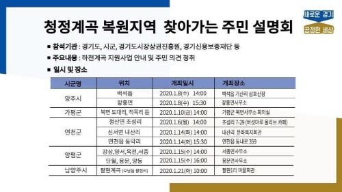 민선 7기 경기도가 역점 추진하고 있는 ‘하천 및 계곡 정비사업’에 따라 불법시설을 철거한 지역주민과 상인들의 생계대책 마련을 위한 ‘청정계곡 복원지역 찾아가는 주민설명회’가 오는 21일까지 연천, 양주, 가평, 양평, 남양주 등 5개 시군에서 총 9차례에 걸쳐 개최된다.