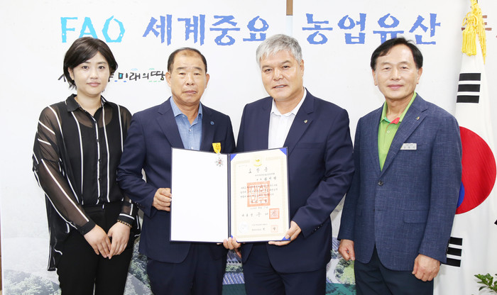 | ▲ 김기영 회장(왼쪽 두 번째)이 문정우 금산군수(오른쪽 두 번째)와 국민포장 수상 기념사진을 찍고 있다. |