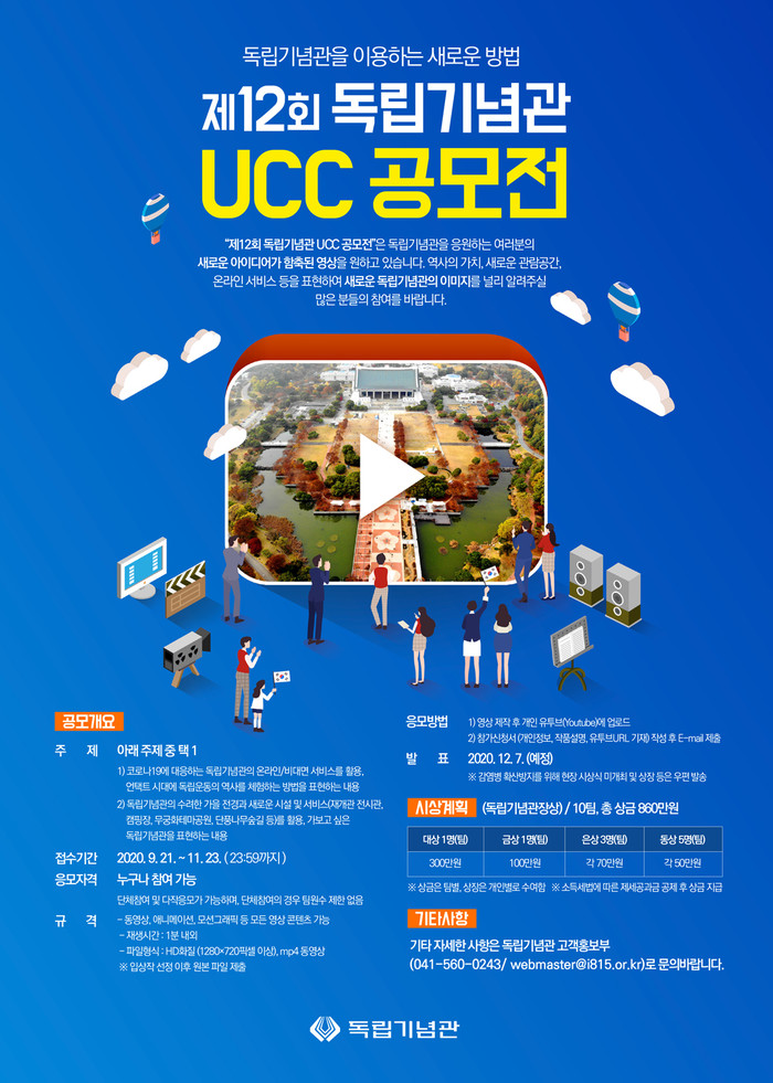 이번 공모전은 ‘코로나19에 대응하는 독립기념관의 온라인 비대면 서비스를 활용, 언택트 시대에 독립운동의 역사를 체험하는 방법’ 또는 ‘독립기념관의 수려한 가을 전경과 새로운 시설 및 서비스를 활용, 가보고 싶은 독립기념관’을 표현하는 두 가지 주제 중 하나를 선택해 제작된 1분 내외의 영상을 공모하며 누구나 참여가 가능하다.