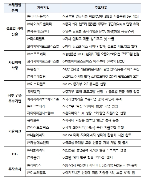 ㈜미스터밀크는 자체 개발한 젤라또 제품을 동남아시아 시장에 첫 수출하며 식품 제조업계의 글로벌 진입 가능성을 입증했고, 페리지에어로스페이스㈜는 미국 워싱턴 D.C.에서 열린 한-미 뉴스페이스 세미나에 참가해 미국 우주산업 관계자들과의 교류를 통해 글로벌 네트워크를 확대했다.