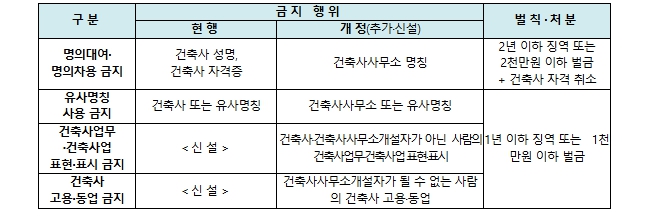 하지만 건축사사무소의 명의를 대여·차용하거나 건축사사무소 또는 이와 비슷한 명칭을 사용하는 행위, 비(非) 자격자의 건축사업무 또는 건축사업 표현·표시 및 건축사 고용·동업 행위 등에 대해서는 처벌 규정이 없어 건축 시장질서 혼란과 국민 피해가 지속되어 왔다.