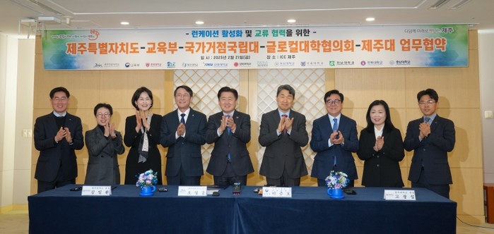 제주특별자치도가 교육부, 9개 국가거점 국립대학교, 글로컬대학협의회, 제주대학교와 글로벌 런케이션 허브 조성을 위한 협력 관계를 구축했다.