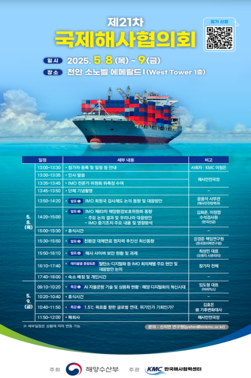 해양수산부는 5월 8일과 9일 이틀간 천안에서 ‘제21차 국제해사협의회’를 개최한다고 밝혔다.