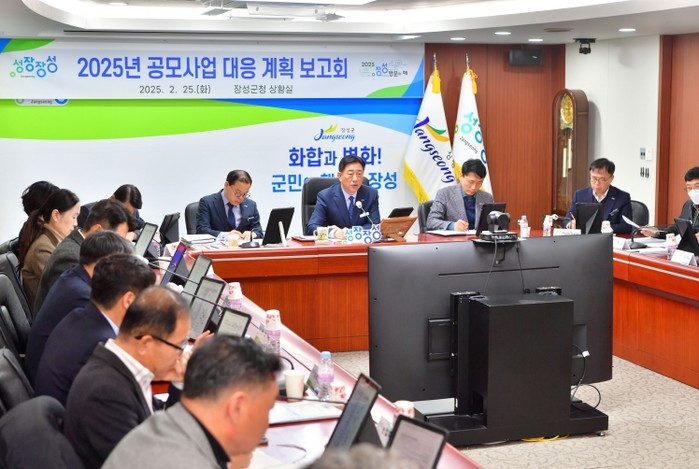 장성군이 25일 군청 상황실에서 김한종 군수 주재로 공모사업 대응계획 보고회를 가졌다.