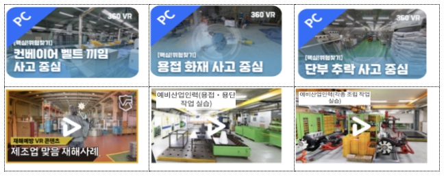 산업현장 유형별 재해 사례, 추락, 끼임, 화재 등 발생할 수 있는 안전사고를 가상현실 체험을 통해 생생하게 경험하여, 안전사고에 대한 경각심을 높일 수 있을 것으로 예상된다.