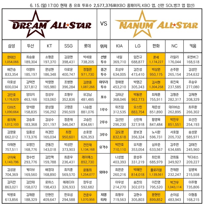 ▲ 2025 신한 SOL뱅크 KBO 올스타 ‘베스트12’ 팬 투표 2차 중간 집계 결과 |