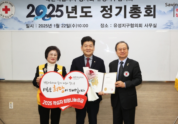 대전광역시 유성구의회 김동수 의장이 22일, 대한적십자사 유성지구협의회 정기총회에 참석하여, 2025년도 적십자 특별회비를 전달하고 지역사회 나눔 문화 확산에 적극 동참했다.