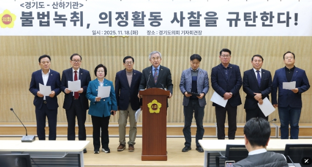 경기도의회 도시환경위원회(김시용 위원장, 국민의힘, 김포3)는 18일 경기도의회 기자회견장에서 진행된 기자회견을 통해 경기도 기후환경에너지국 소속 공직자가 산하기관인 코리아경기도주식회사 직원에게 의원 간담회 내용을 불법 녹음하도록 지시한 사실을 강력히 규탄했다.