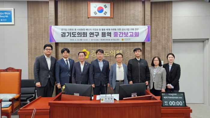 경기도의회 기획재정위원회 소속 의원 연구단체인 기획재정연구회(회장 조성환, 기획재정위원장)는 30일 오후 경기도의회 기획재정위원회 회의실에서 '경기도 다문화 등 사회통합 예산의 구조화 및 활용 체계 마련을 위한 관리기반 구축 연구'에 관한 연구용역 중간보고회를 개최했다.