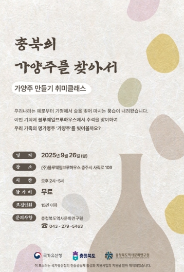 충북도와 충청북도역사문화연구원(원장 김양희)은 국가유산청의 ‘2025 전승공동체 활성화 지원사업’의 일환으로 '충북의 가양주, 청년과 함께하다' 사업을 추진하고 있다고 밝혔다.
