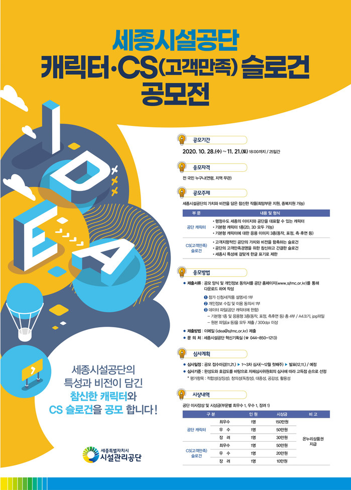 이번 공모전은 세종시의 특성을 반영한 공단을 상징하는 캐릭터와 고객만족경영을 위한 CS(고객만족) 슬로건 두개 부문을 대상으로 하며 공모기간은 28일부터 다음달 21일까지로 공모전에 관심이 있는 사람이면 누구나 참여 가능하다.