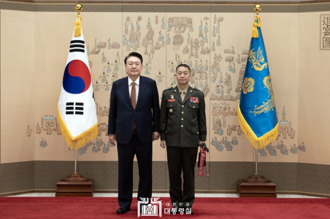 ▲ 11월 27일 윤석열 대통령은 용산 대통령실에서 주일석 신임 해병대사령관, 강정호 신임 해군 교육사령관, 김경률 신임 해군사관학교장, 손정환 신임 합동참모본부 전략기획본부장, 박기완 신임 공군참모차장, 차준선 신임 공군사관학교장으로부터 중장 진급 및 보직 신고를 받고 삼정검 수치를 수여했다. |