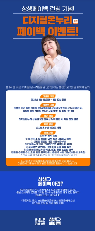 아울러 상생페이백 런칭 기념으로 이달 30일까지 디지털 온누리 앱에서 상품권을 누적 5만원 이상 충전하면 추첨을 통해 1만원의 상품권을 총 1만명에게 지급하는 이벤트를 진행한다.