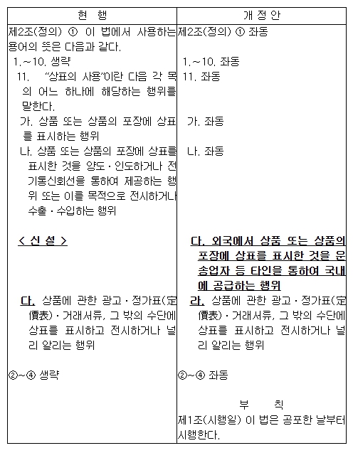 이에 따라 상표법상 ‘상표의 사용’ 하위 행위유형으로 제2조제1항제11호다목 ‘외국에서 상품 또는 상품의 포장에 상표를 표시한 것을 운송업자 등 타인을 통하여 국내에 공급하는 행위’를 추가했다.