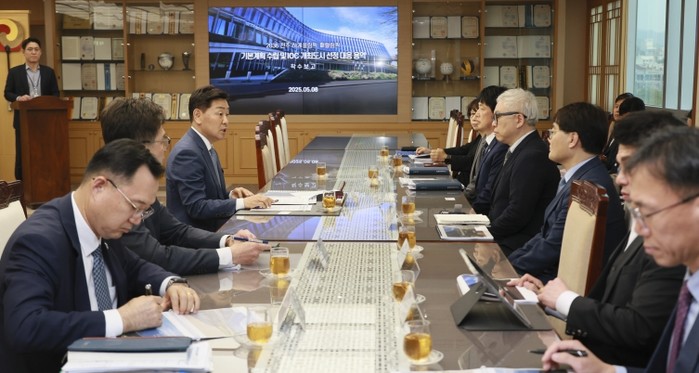 | ▲ 8일 전북특별자치도청 회의실에서 열린 전주 하계올림픽.패럴림픽 기본계획 수립 및 IOC 개최도시 선정 대응 용역 착수 보고회에 김관영 도지사를 비롯한 참석자들이 보고회를 갖고 있다 |